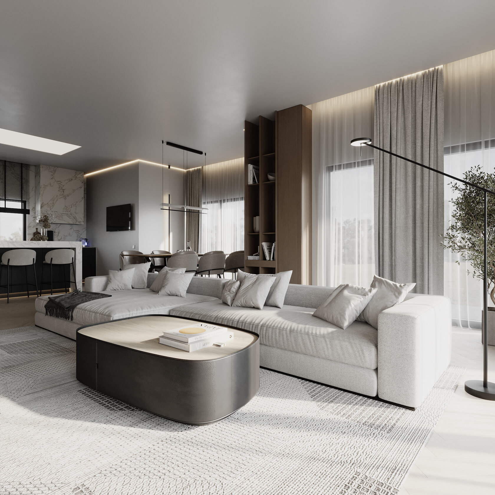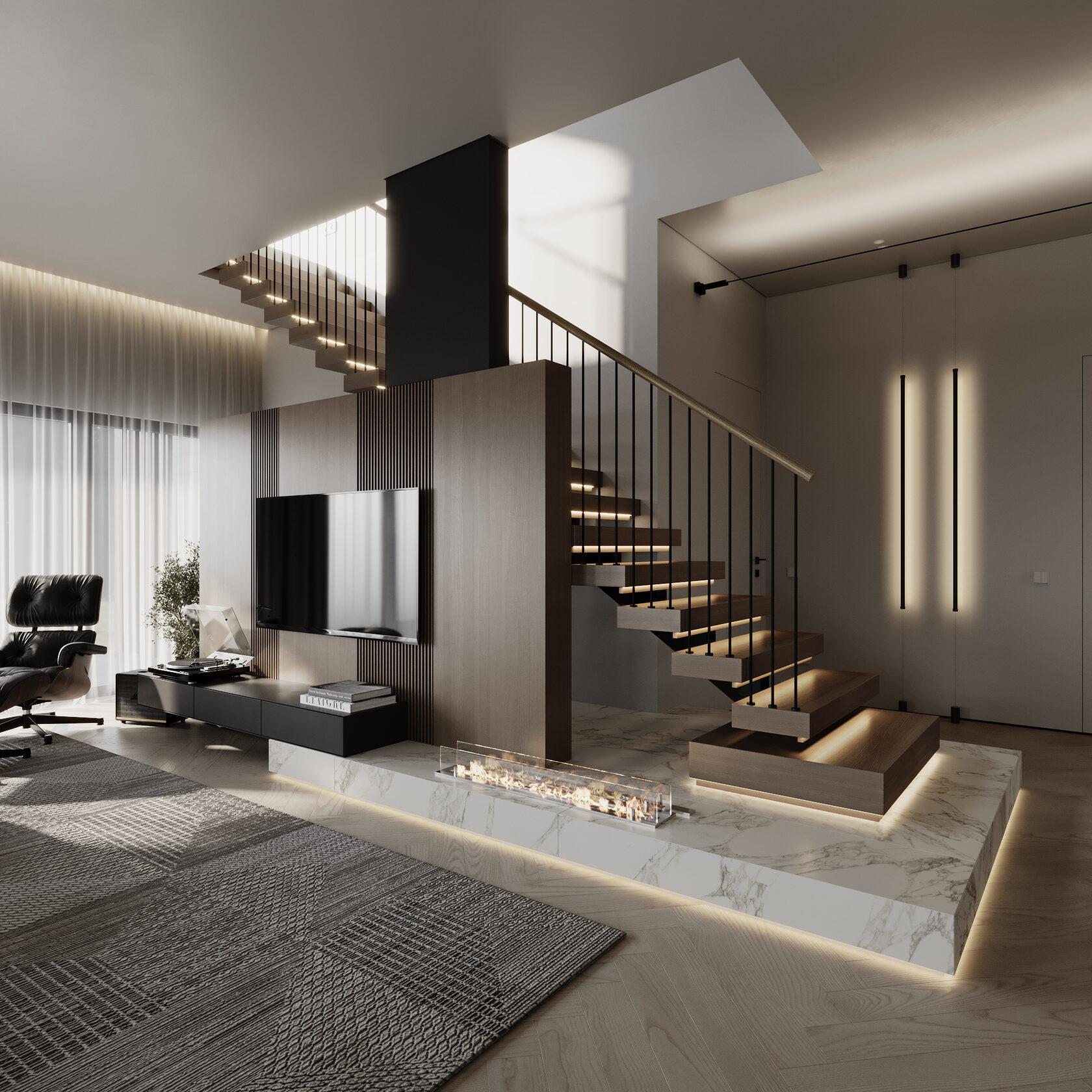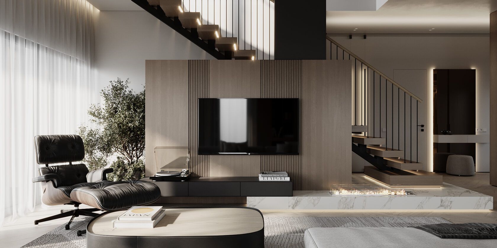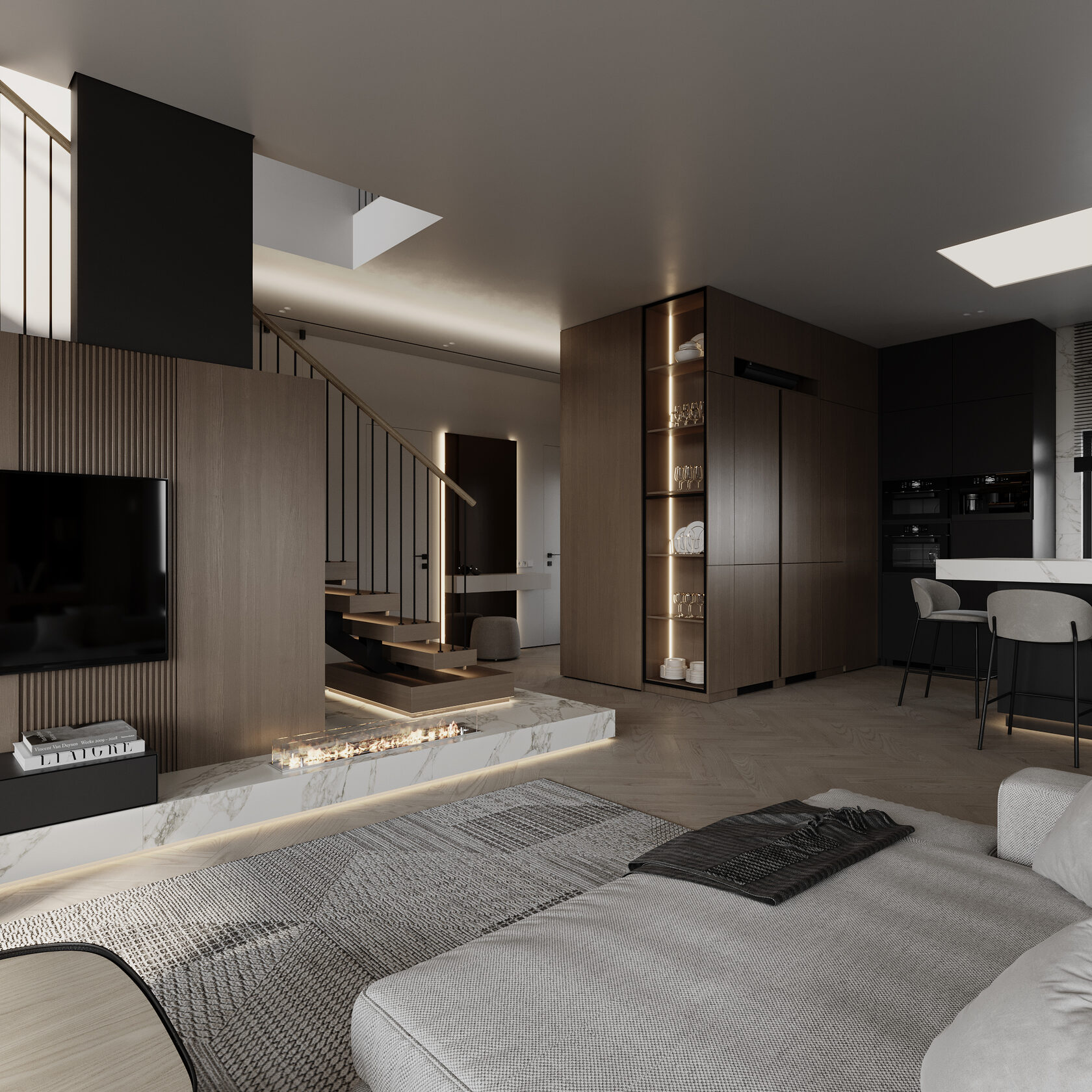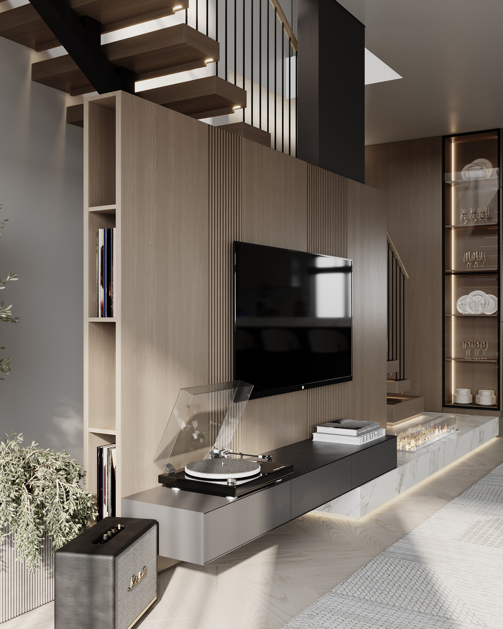 At the core of the project is a custom-built media wall, integrated into a larger architectural composition that defines the main living space. The goal was to create a home that feels open, refined, and intentionally designed, where every detail contributes to a cohesive visual experience.