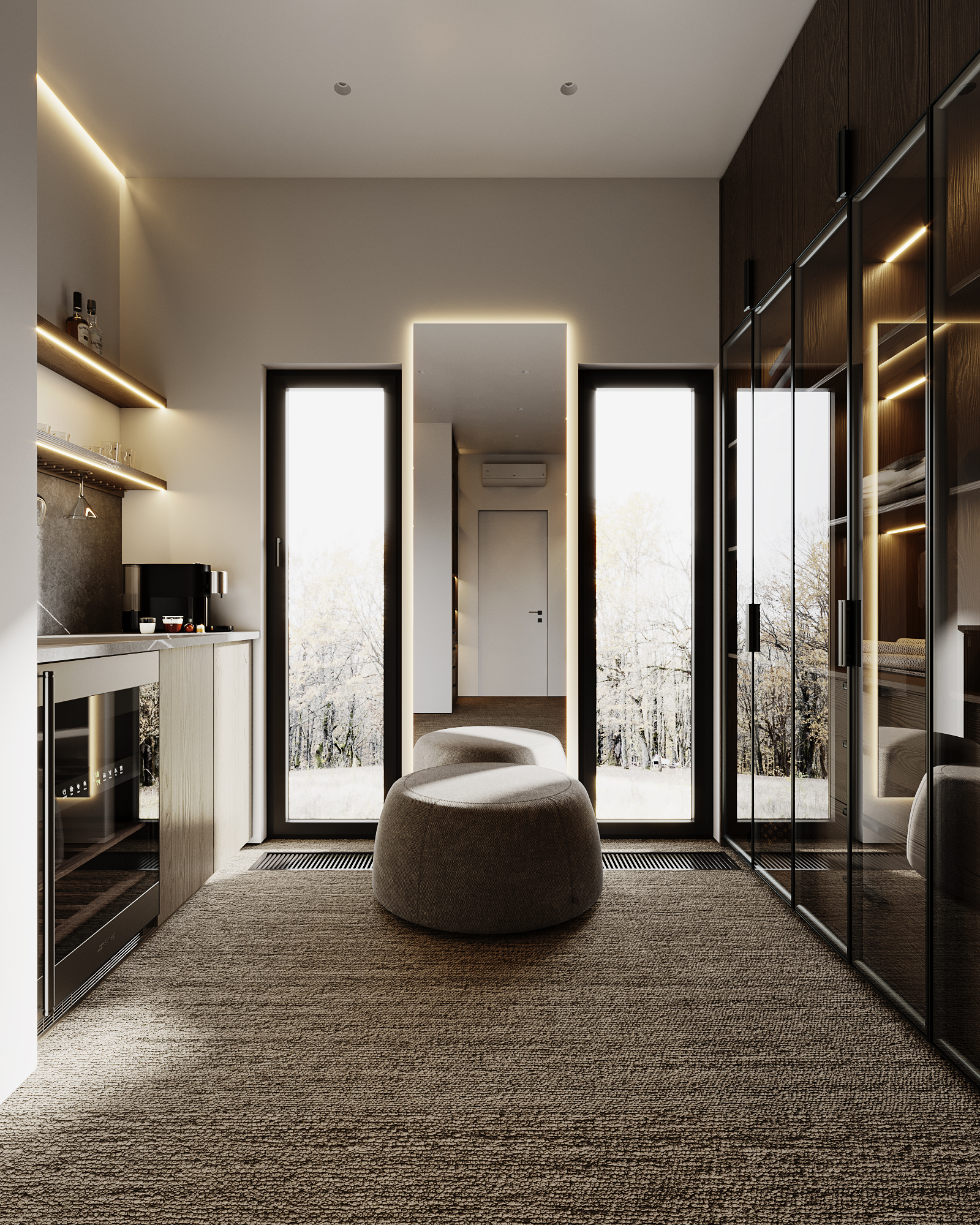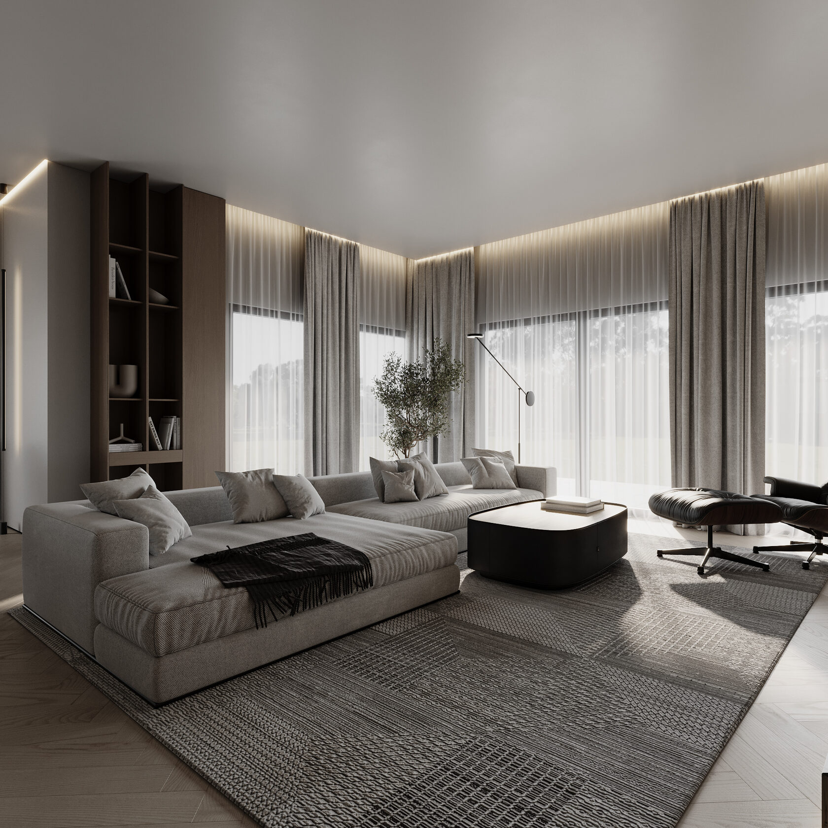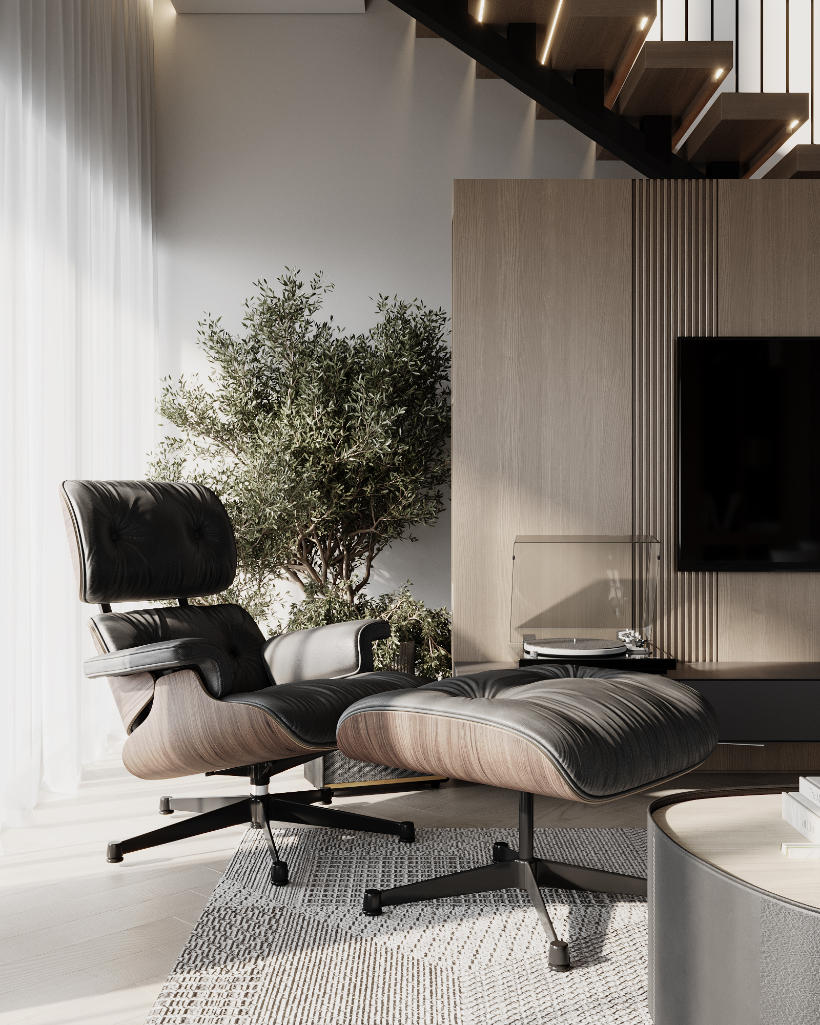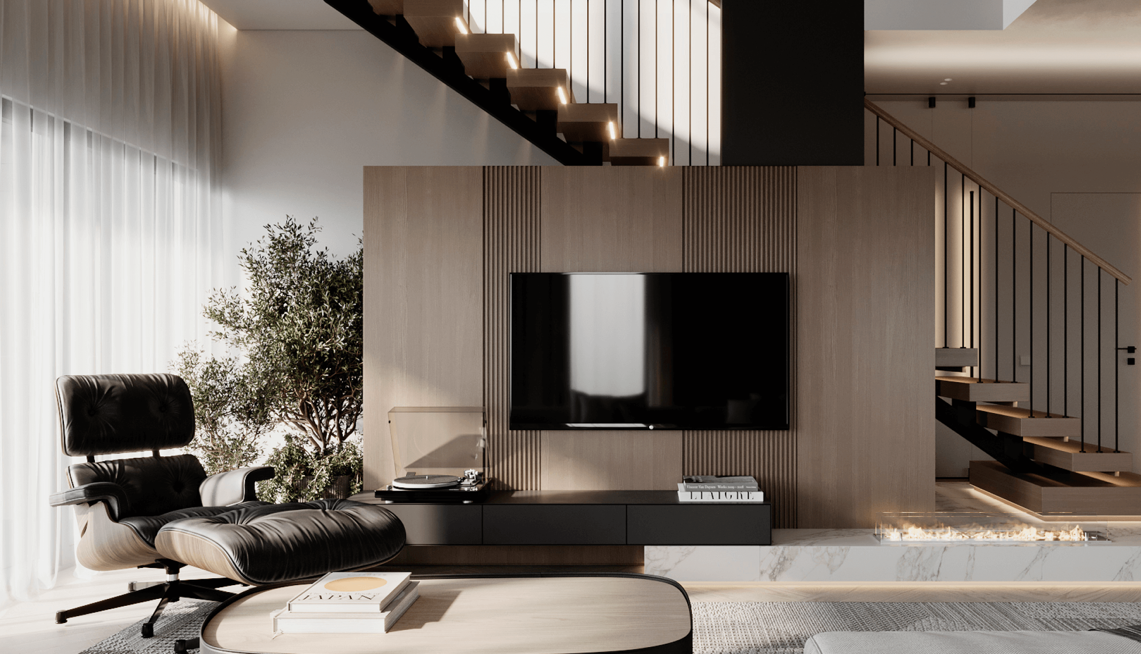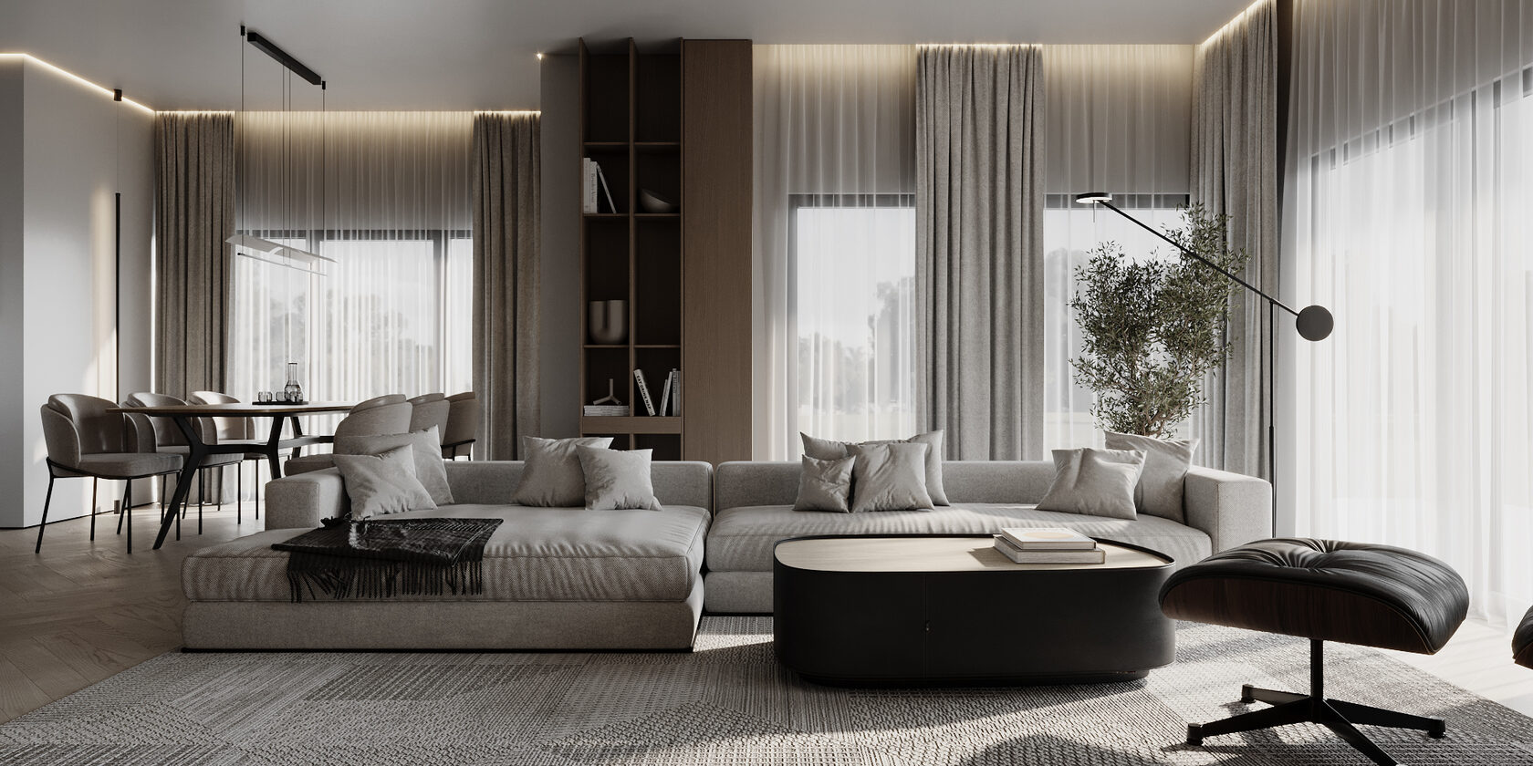 At the core of the project is a custom-built media wall, integrated into a larger architectural composition that defines the main living space. The goal was to create a home that feels open, refined, and intentionally designed, where every detail contributes to a cohesive visual experience.